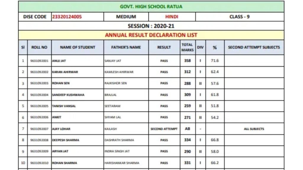 Once you access your mark sheet from the vimarsh portal mp, you will see many important details. These details help verify your identity and result status.